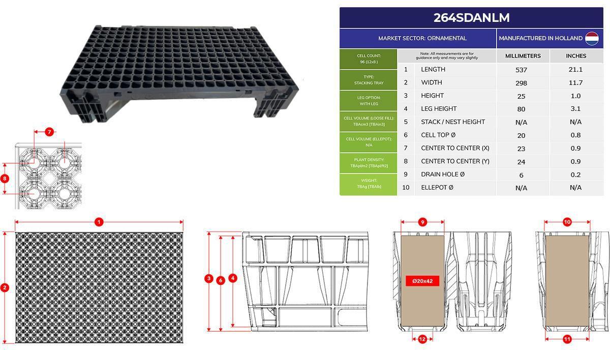 ceastă tavă vrac daneză, foarte rezistentă și stivuibilă, cu picioare, este o tavă excelentă pentru plante de uz general, cu automatizare încorporată și picioare, care acționează ca sistem de susținere în seră și, de asemenea, pentru transportul tăvilor cu plante stivuite. Disponibilă și fără picior, sub denumirea 264SDANM.