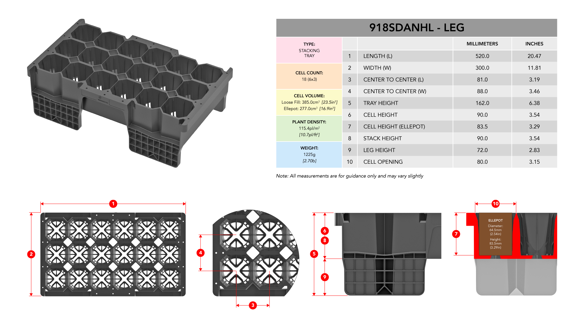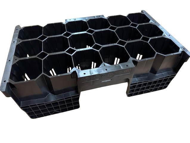 Tava noastră cu 18 bucăți este turnată prin injecție pentru o durată de viață foarte lungă și este o tavă hibridă, ceea ce înseamnă că poate fi umplută vrac sau poate conține un mediu stabilizat, cum ar fi un Ellepot. Are opțiunea cu/fără picior, iar piciorul permite circulația aerului sub tavă și prin celule atunci când este așezată pe sol; este practic încorporată în bănci.